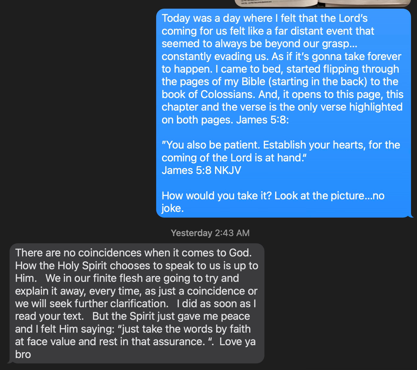 I am currently going through the book of Colossians. I usually have a bookmark in the passage that I am studying. Well, my bookmark wasn't there this time. So, instead of starting to turn the pages of Scripture from Genesis, I started from the book of Revelation. As I began thumbing through the pages of my Bible, the first swipe opened up to page 1499 (in my Bible)...to the book of James. Now, before you say, "Who cares, it's just a “coincidence”, let me tell you that I have hundreds of passages highlighted in my Bible, and it would be hard to find a page that didn't have multiple passages highlighted. But both of the pages I opened had no highlights except for one passage, and only one passage. This is what the Lord said to me through His Word (please don’t forget what I had been pondering in my mind):